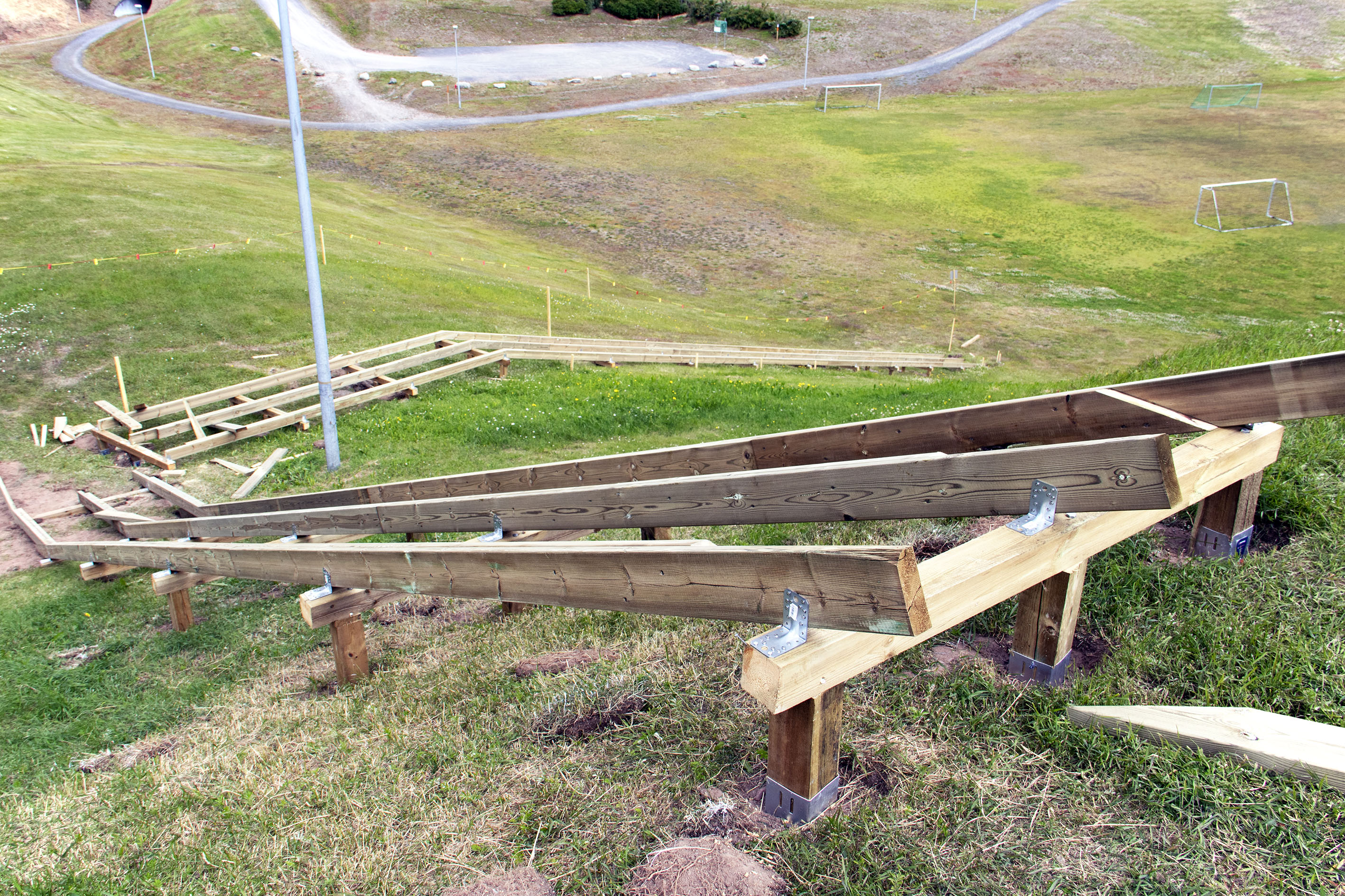 – Suunnittelijan piirustuksissa askelmia on 82, mutta se voi vähän elää todellisesta rinnekulmasta riippuen. Varsinaista porrasmatkaa on sellaiset nelisenkymmentä metriä ja korkeuseroa reilut kolmetoista metriä. Tavallaan ne nousevat ensin pulkkamäkiosuuden, jonka jälkeen tasaisessa kohdassa on seitsemän metrin taso ja siitä portaat nousevat hyppyrimäen kumpareen päälle, Peteri kuvailee.